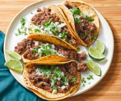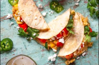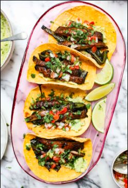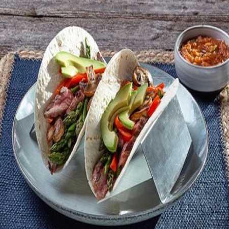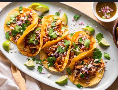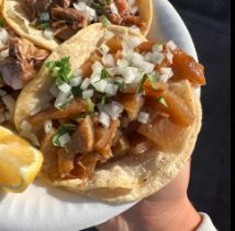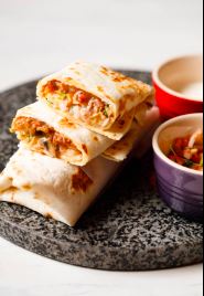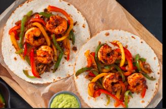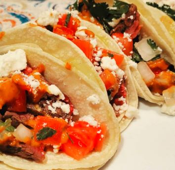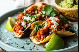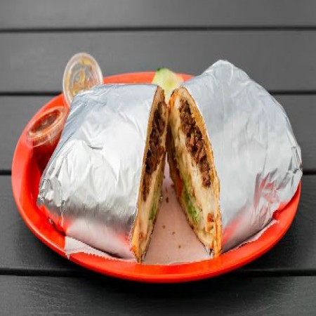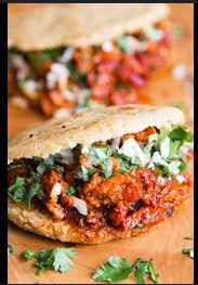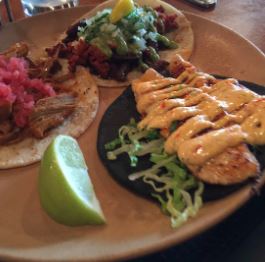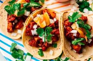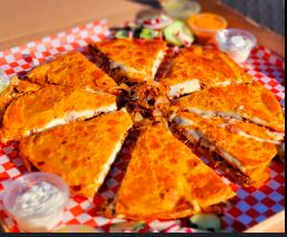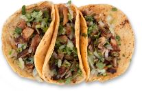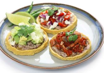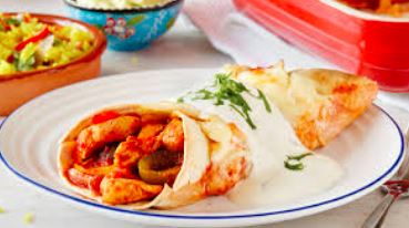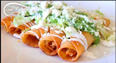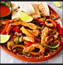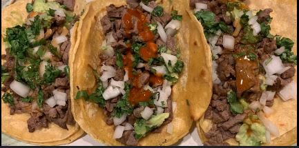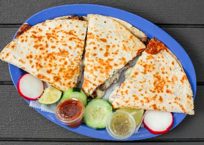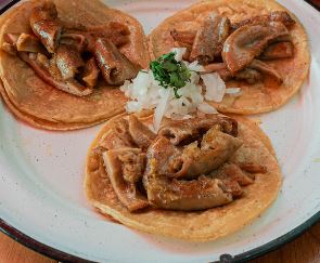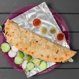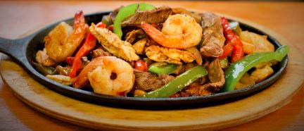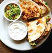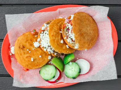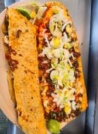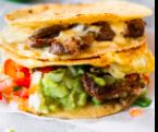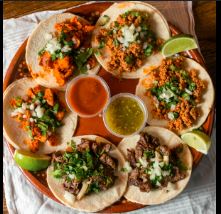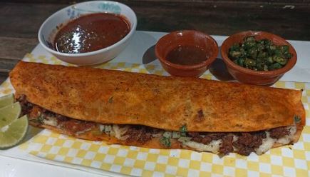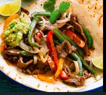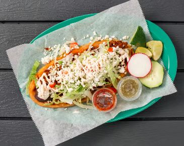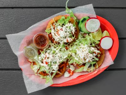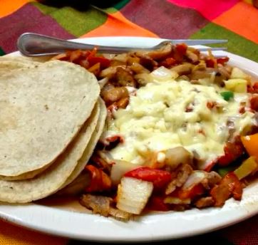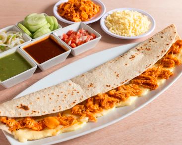 Acompañado con cebollas, lechuga, pico de gallo, crema, arroz y frijoles / Acompanied by onions, lettuce, pico de gallo, cream, rice and beens.