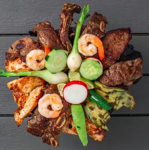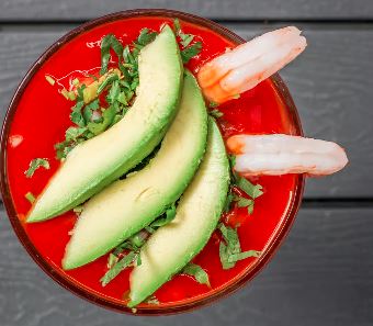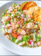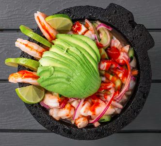 Acompañado de aguacate, cebolla, cilantro, tomate, tostadas, limón y su salsa especial /Acompanied with avocado, onion, cilantro, tomato,toast, limon and special souce.
